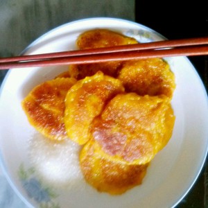 3.将锅烧热倒入菜籽油,油温至7层时把做好的南瓜饼放入锅里炸至两面金黄捞出控油装盘,再配上白糖或者自己喜欢的沾料,简单又好吃的南瓜饼就完成咯。