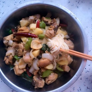 把做好的鸡块浇在面条上,这样香喷喷的大盘鸡拌面就