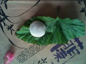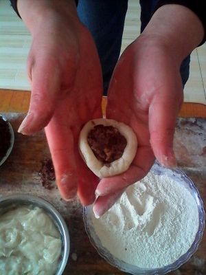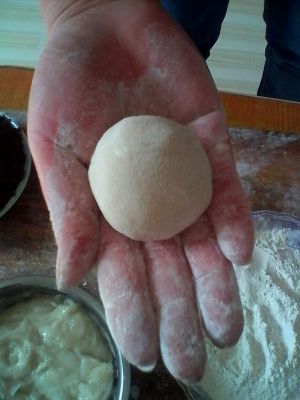 手上沾上炒熟的江米面干粉,这时候再取大约汤圆大小的熟米糊从外向里搓揉成外面光滑的面皮。制做过程中为防止粘手可以沾取炒好的江米面再继续做。外皮揉至光滑时包入红豆沙封口揉圆即可。