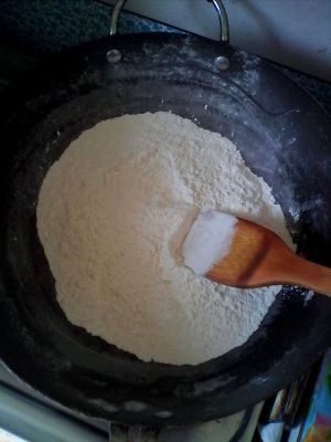 取适量的江米面放入无油干净的锅中小火炒至江米面微黄,有米香味就可以了。