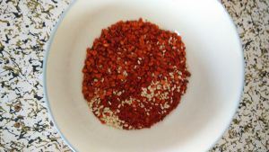 辣椒面倒出半碗来,撒一些白芝麻,这样辣椒油口感好,味道香