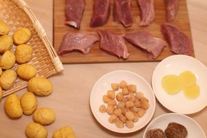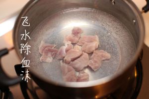 将食材从包装中取出放置在碟子中,猪瘦肉洗净切块后飞水,除去血沫儿.