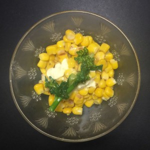 待玉米粒飘上来,就可以滤水出锅了。根据个人喜好,我加了一点点炼乳,和少量低脂色拉酱,放以一片有机菜点缀(你可以将绿叶菜在刚刚的沸水锅中炒水至熟)一份健康的奶油玉米色拉就完成啦。