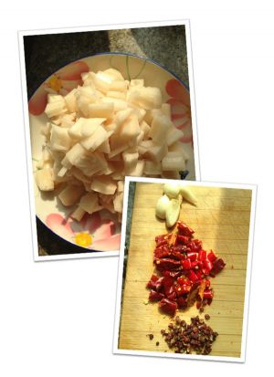 藕去皮洗净切丁(切好后用水冲去白色的东东啦!)大蒜、花椒、我的干辣椒没货了就用了点朝天椒,友友们随意哈。开始做啰〜〜〜〜
