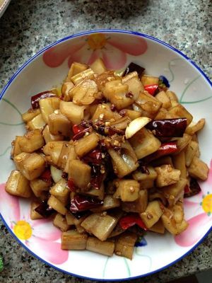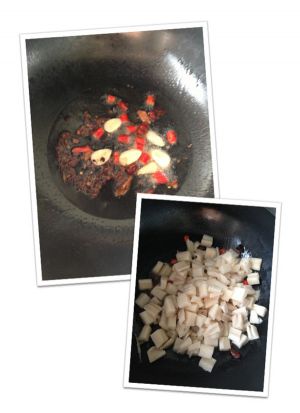 锅中放入适量油,依次放大蒜、花椒、辣椒煸香(我是先放的新鲜的辣椒,如果是干辣椒稍微晚点点放,要不该糊了,我家火大)倒入藕丁翻炒〜〜〜