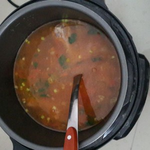 高压锅加热水,将排骨和炒好的西红柿一起倒入高压锅,放入几片姜,少许盐。上盖。压十五到二十分钟。