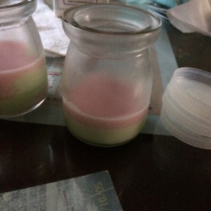 第一个颜色做好后放入冰箱冷藏30分钟左右,视凝固程度决定。接着重复以上两步骤,放入第二层颜色,再放入冰箱。~~~