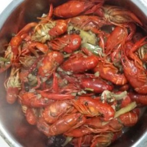 倒入洗干净的小龙虾翻炒,龙虾外壳变红后,加入盐(盐可以多放点,这样方便入味)酱油、生抽和糖,再继续翻炒一会。