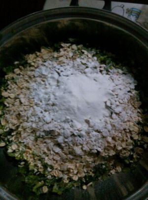 加入快熟燕麦搅拌均匀,燕麦可以帮你吸掉很多水而且是粗粮对减肥有益!(白色部分是宿舍剩的一点糯米粉,为了不浪费就一起倒里了,别学我)