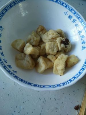 将豆腐泡洗净,在做所有的工作之前将粉丝用水泡上,更容易熟!【豆腐泡可加可不加,阿莹喜欢吃!】