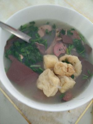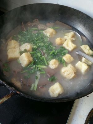 开锅后下入鸭血,鸭货!然后等再次开锅下入粉丝,粉丝被泡完很软,很易成熟!下入粉丝后加入盐,白胡椒粉,鸡精调味!粉丝成熟后加入香菜,就可以出锅了!
