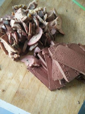 将锅烧水,加入料酒!水开,焯一下鸭血,去血腥味! 大约2-3分钟!捞出!这步我忘拍照了! 然后将鸭血切片,鸭胗鸭肠鸭肝切片切段!