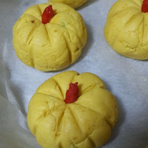 用牙签压成南瓜形状,用红枸杞或者葡萄干点缀