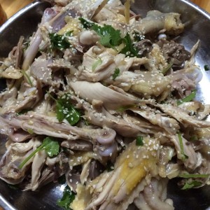 冷水泡一下,拿出来后慢慢用手撕好,加进酱料,搅拌均匀,加上香菜,再加点芝麻,香喷喷的手撕鸡完成了!!