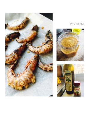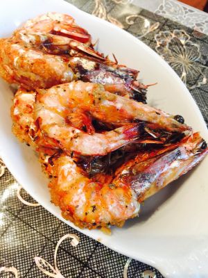 腌制好的大虾,背部填入蒜泥酱,刷上橄榄油,散上香草碎,迷迭香也可以,风味不同。