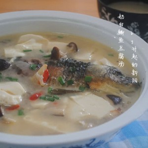 倒入开水煮5分钟左右,直至汤成奶白色,放入豆腐、香菇块一起大概煮3、4分钟。
