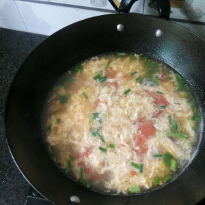 待汤烧开,将打好的鸡蛋散在上面,待锅开后放盐味精及葱花!好了西红柿蛋汤就出来啦!!!!
