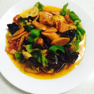 西红柿 辣椒 火腿肠 切块 水发木耳提前泡好 蒜切末