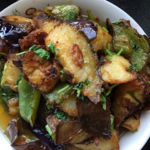 炒锅放平时炒菜用量的油,放青椒,放豆瓣酱,煸炒。青椒表皮起泡,放炸好的茄子,翻炒。放一点点陈醋,几滴就行,先在锅底上预热挥发一下,再翻炒。放一勺生抽,翻炒,放盐,出锅