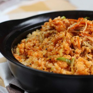 将切好的配品(不含黄瓜和泡菜)入锅翻炒, 加入海鲜酱油、盐炒熟后出锅