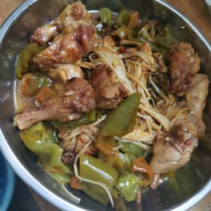 热锅加油放入腌制好鸡腿煎出金黄色加入青椒金针菇,又碗调好料,可乐半瓶300毫升,加入生抽,耗油,蒜蓉酱鸡精,许盐搅拌好倒入锅中盖锅焖八分钟出锅即可