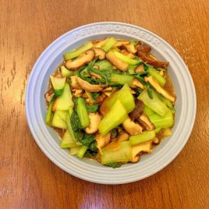 下入香菇青菜大火翻炒,最后放鸡精出锅