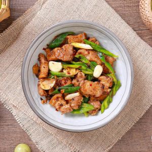 取出,加入青红椒、蒜苗,倒入酱汁拌匀,加盖留孔放入微波炉中,微波高火烹饪3分钟。