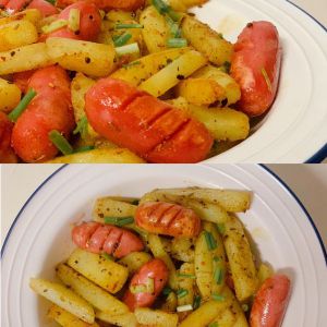 土豆八分熟的时候倒入香肠,煎到开花后放一勺孜然一勺辣椒粉,有烧烤料的直接放也可以。撒点白芝麻和葱花提提香~跟小吃摊的一样好吃,下电视去!