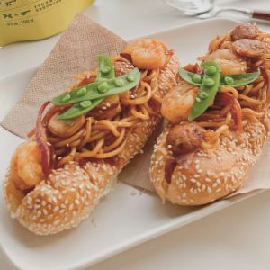 热狗面包中间切一刀不切断,然后喷点水放入微波炉叮一分钟,取出来后,把炒面塞入到面包中就完成啦。