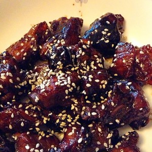 放入排骨,用中小火烧至汤汁快干时,加醋翻炒至收汁亮油,淋入少许香油翻匀就可以出锅了。这其间要注意火候,特别是最后时刻,因为汁黏稠,很容易炒糊