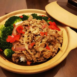 碗里盛一碗米饭 周围摆上西蓝花和胡萝卜 中间放上肥牛 浇点汤汁 撒上芝麻 完美