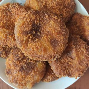 南瓜蒸熟后倒上大盆放适量的白糖糯米粉,揉成一个面团,取一小个剂子搓圆按扁,先沾一下淀粉,再裹一层蛋液,最后裹上面包糠,简单的南瓜饼坯就做好了。