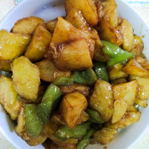 起锅烧油,放入葱姜蒜爆香,加入料汁,放入土豆、茄子、青椒翻炒。将料汁炒匀后可在加入水淀粉收汁,出锅!