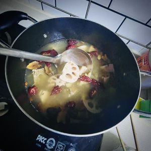 35分钟后放入切好的藕块~盖好盖子文火炖煮40分钟后加入热水500~1000ml(如果最开始加水多可不放)后放枸杞红枣小火偏大些炖25分钟~就可以出锅啦~