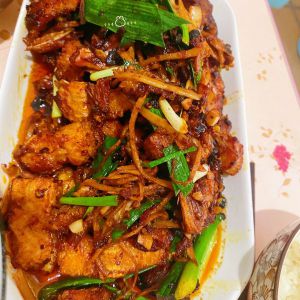 下入鱼块快速翻炒两分钟,起锅前下入蒜苗。