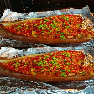 ④茄子烤软一戳就烂的程度就可以用小刀轻轻划破上皮,把茄子平铺,挖蒜蓉辣酱刷在茄子上再放入烤箱200度烤10分钟。