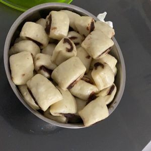 面粉发酵好后取出,排气,用擀面杖擀成面皮,加入豆沙躺平,卷起