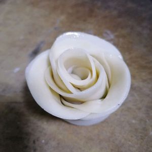 4、对折后由左往右卷起,收口处沾水轻轻捏紧,做成玫瑰花的样子