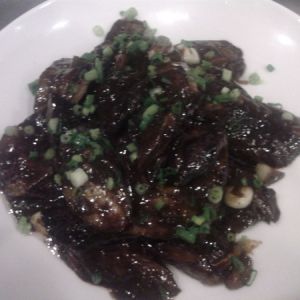 加入茄子,然后稍微翻炒一下,保持每片的完整,装盘撒葱花即可。