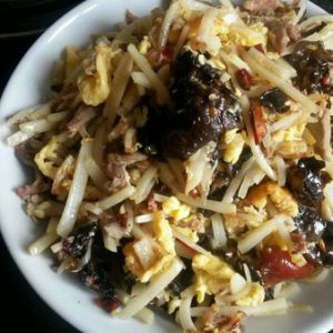 首先准备好主料食材,鸡蛋两个,一个大土豆,一份泡发好的木耳,还有吃剩下的烤鸭肉给撕碎。