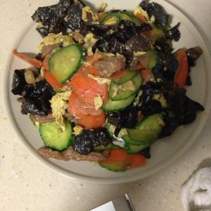 放油,可先把木耳和胡萝卜先翻炒一下,乘出,在放油,姜末,葱末炝锅,放肉炒制颜色发白,下木耳胡萝卜再翻炒,可放些许酱油,在放黄瓜片,鸡蛋翻炒,最后放盐和鸡精,出锅!