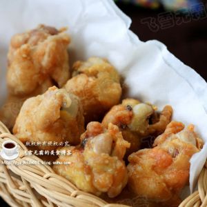取出后,控干水分,加入淀粉均匀的裹上,放入油锅中炸,炸至金黄色取出