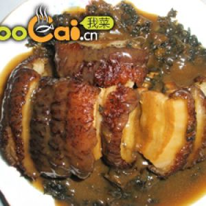倒出原汁,将梅菜扣肉复扣于盘里。原汁加入湿淀粉勾芡,淋入肉面上即成。