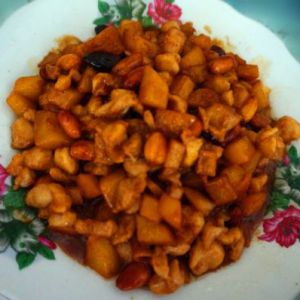 鸡肉丁、土豆丁、花生放一起,加一碗左右水,加酱油、白醋少许,糖(多),盐少许,淀粉加水倒入,勾芡,翻炒,收汁,即可。