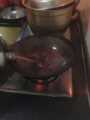 锅烧热,多放些油,放花椒,炸到变色后捞出不要,放八角,桂皮,葱姜爆香,放老抽,生抽,酱油,炒香。