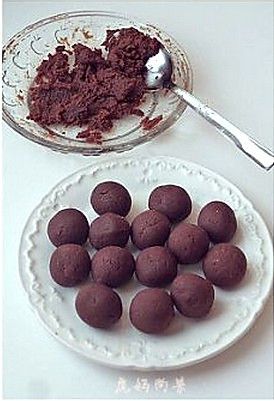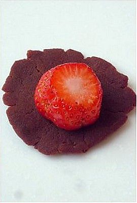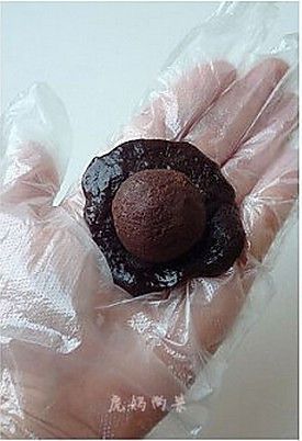 将可可面团也分成每18克一个的小剂子,在手心里按成圆形薄片,上面放上蓝莓豆沙馅球,并包好收口。