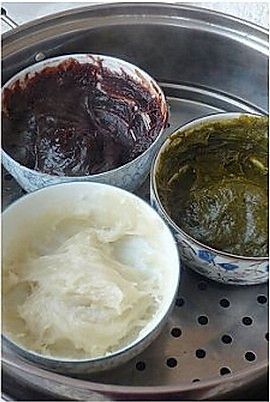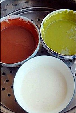将面糊同等的分入3只碗中,一只中加入可可粉3克水5克拌匀,另一只碗中加入抹茶粉3克清水4克拌匀,