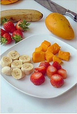 蒸元宵皮料的时间可以准备馅料,将香蕉、芒果、草莓洗净控干水份后切成小块。做可可元宵用的蓝莓干要提前半天用大象酒浸泡至软。