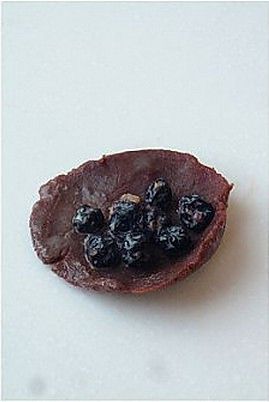 可可蓝莓干元宵:将豆沙球在手心里按成薄片,上面放上浸泡柔软的蓝莓干,然后裹紧收口滚圆。
