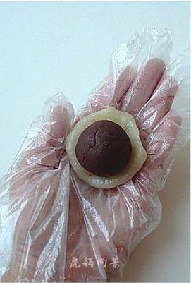 将豆沙球在手心里按成薄片,上面放上水果块,包裹收口后再次的滚成小球待用。